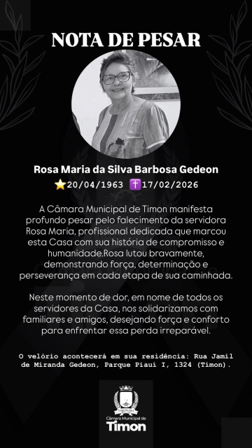 Que Deus conforte os corações enlutados e receba Rosa Gedeon em Sua infinita misericórdia. Timon amanheceu mais triste nesta terça-feira, 17, com a notícia do falecimento de Rosa Gedeon, servidora pública da Câmara Municipal de Timon, mulher de fé, de trabalho e de uma delicadeza que marcava a todos que com ela conviviam.