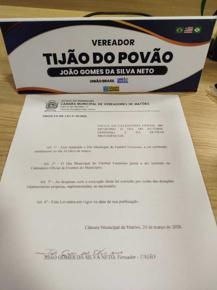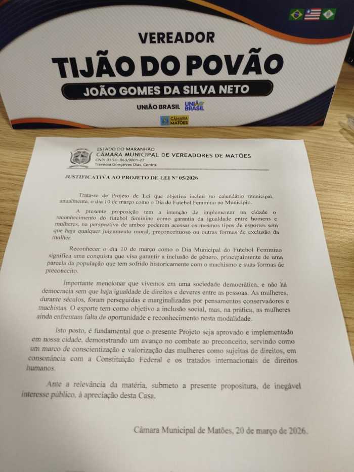 Com este projeto, o vereador Tijão do Povão reafirma seu compromisso incansável em promover a inclusão e valorização das mulheres no esporte, garantindo que o futebol feminino receba a atenção e o respeito que merece. Aprová-lo é um passo essencial para construir uma sociedade mais justa e igualitária em Matões.