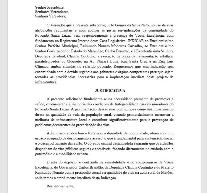 Em sua indicação, Tijão do Povão pede ao Excelentíssimo Senhor Prefeito Municipal, Raimundo Nonato Medeiros Carvalho, ao Governador do Estado do Maranhão, Carlos Brandão, e à Deputada Estadual, Cláudia Coutinho, que sejam realizadas obras de pavimentação asfáltica, paralelepípedo ou bloquete nas ruas Av. Nazaré Lima, Rua Santa Cruz e Rua Luis Climaco. O vereador enfatizou a urgência dessa solicitação para que os gabinetes e órgãos competentes adotem as providências necessárias para a implementação desse projeto de infraestrutura, que é tão vital para a comunidade.